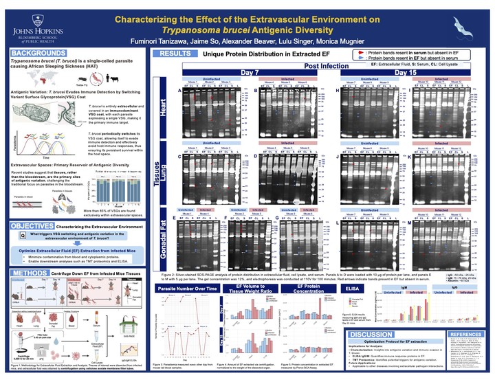 Abstract The protozoan parasite Trypanosoma brucei poses significant public health and economic burden on sub-Saharan Africa. This single-celled parasite relies on antigenic variation to cause chronic infections, periodically “switching” its dense variant surface glycoprotein (VSG) coat to escape recognition by host antibodies. While researchers have predominantly focused on parasites in the bloodstream, recent studies suggest that the primary reservoirs of antigenic diversity of parasites are in the extravascular spaces—areas between cells within tissues. Understanding these potential triggers for VSG switching is crucial for insights into the parasite’s immune evasion and persistence. In this study, we sought to optimize a protocol for extracting extracellular fluid (EF) from infected mice for downstream analyses such as TMT proteomics and ELISA. We dissected mice and collected tissues, including adipose tissue, heart, and lung. The tissues were centrifuged on a filter at various speeds to extract EF while minimizing contamination from cytoplasmic proteins released by tissue damage. Additionally, we tested different techniques, such as washing and perfusion, to identify the optimal method for obtaining EF without blood. SDS-PAGE confirmed that the EF contained distinct protein components compared to cell lysate and serum. Our results showed that specific centrifugation speeds and dissection techniques effectively minimized contamination, providing a reliable EF extraction method. This optimized protocol enables accurate and standardized characterization of EF, contributing to advancing our understanding of the role of the extravascular environment in Trypanosoma brucei infection and potentially other diseases.
